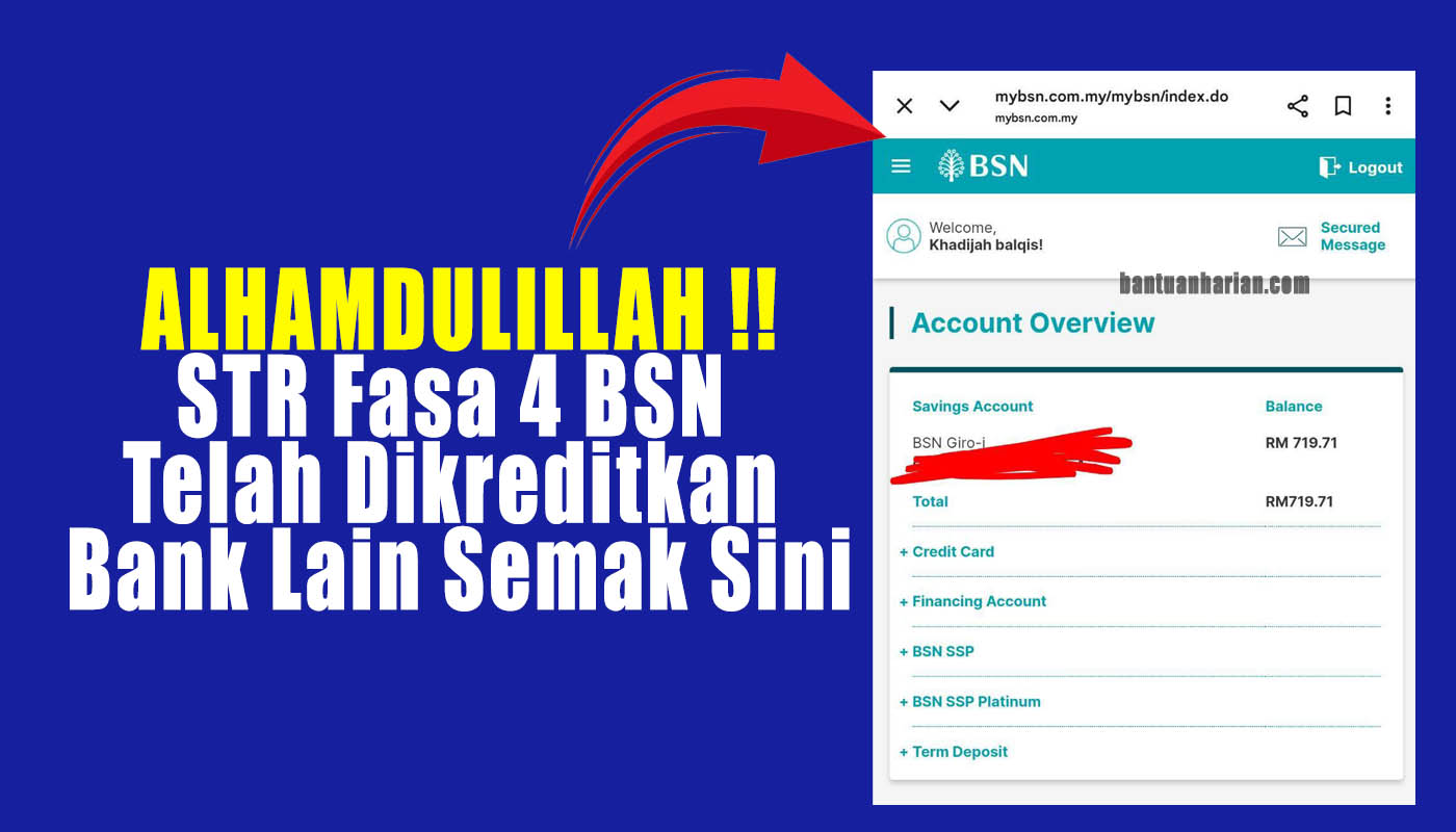 Berita gembira buat seluruh penerima Sumbangan Tunai Rahmah (STR) di Malaysia! Kerajaan mengesahkan bahawa bayaran STR Fasa 4 untuk bank BSN Telah dikreditkan awal pagi ini.