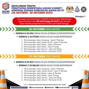 Orang ramai digesa kekal tenang, patuhi arahan trafik, dan rancang perjalanan dengan bijak. Gunakan pengangkutan awam serta pantau maklumat rasmi untuk elak kesulitan semasa tempoh 23 hingga 28 Oktober 2025.