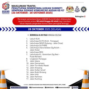 Bermula 23 hingga 28 Oktober 2025, Kuala Lumpur akan melalui tempoh kawalan keselamatan ketat dan penutupan jalan utama sempena Sidang Kemuncak ASEAN ke-47.