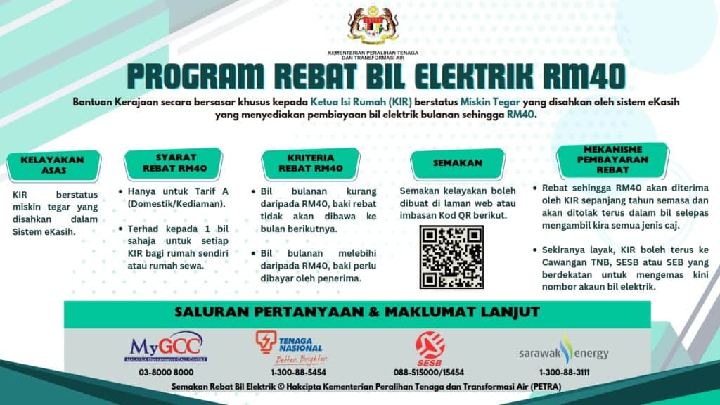 Rebat ini memberi potongan sehingga RM40 sebulan kepada Ketua Isi Rumah (KIR) yang layak — khususnya yang berdaftar dalam eKasih — bagi akaun elektrik domestik Tenaga Nasional Berhad (TNB).