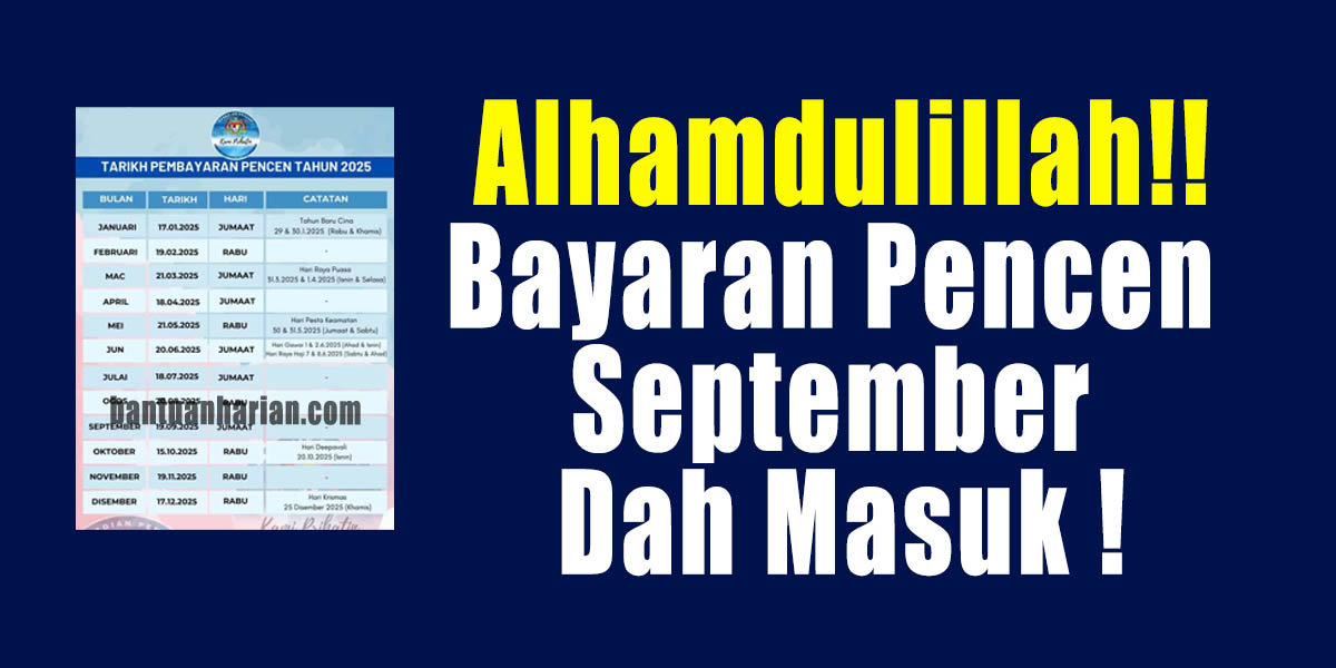 Tarikh bayaran pencen September 2025 ditetapkan pada 19 September (Jumaat) kerana mengambil kira cuti umum Maulidur Rasul (5 September) dan Hari Malaysia (16 September). Penyelarasan ini dibuat untuk memastikan kelancaran operasi perbankan tanpa gangguan cuti panjang.