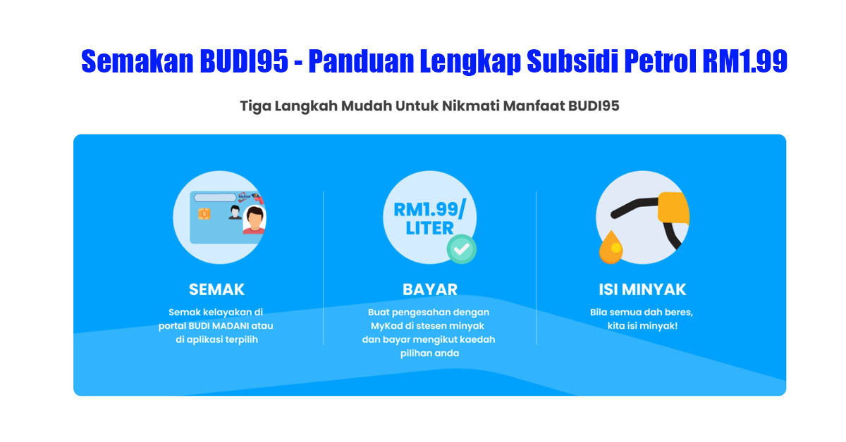 Setiap rakyat Malaysia layak mendapat subsidi 300 liter sebulan yang dikreditkan secara automatik menggunakan pengesahan MyKad. Tiada pendaftaran tambahan diperlukan kerana sistem ini menggunakan data Jabatan Pengangkutan Jalan (JPJ) dan cip MyKad untuk pengesahan. Status kelayakan boleh disemak bermula 25 September 2025 melalui portal rasmi budi95.gov.my atau budimadani.gov.my.
